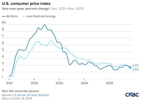 מדד המחירים לצרכן בארצות הברית עלה ב-12 החודשים עד נובמבר בשיעור של 2.7%, נמוך משמעותית מציפיות השוק שעמדו על 3.1%. גם מדד הליבה, המנטרל מחירי מזון ואנרגיה, הפתיע כלפי מטה ועלה ב-2.6% בלבד ב-12 החודשים האחרונים, לעומת תחזית לעלייה של 3%. במונחים חודשיים, הן המדד הכללי והן מדד הליבה עלו ב-0.2%, נתון המעיד על המשך התמתנות בקצב עליית המחירים. ירידה זו בלחצים האינפלציוניים נתפסת על ידי השווקים כסימן לכך שסביבת האינפלציה מתקרבת בהדרגה ליעד של הפדרל ריזרב.