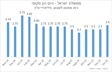 בחודש ינואר צפוי האוצר לגייס סך של 11.5 מיליארד ש"ח בלבד, על פני 4 שבועות של גיוס, כלומר סך של 2.9 מיליארד ש"ח לשבוע, עלייה מ-2.5 מיליארד ש"ח לשבוע, בשלושת החודשים הקודמים.