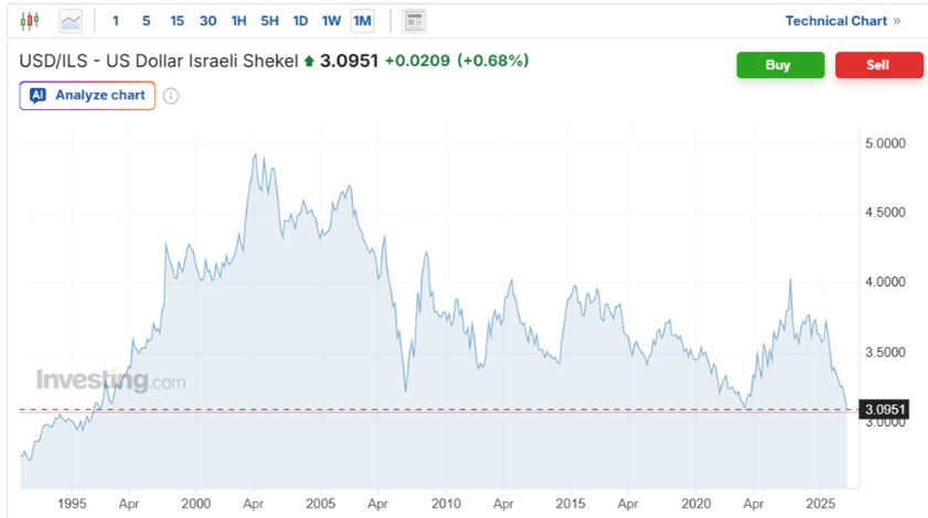 הייסוף המתמשך של השקל מול הדולר, כאשר שער החליפין נסחר לאחרונה סביב 3.09 ש"ח לדולר, לעומת 3.19 שקלים לדולר ב-31/12/25 או 3.6 שקלים לדולר לפני שנה מהווה גורם מוניטרי משמעותי שמקל על סביבת האינפלציה המקומית. למעשה, שער החליפן שב לרמה בה היה ב-1995. התחזקות המטבע מפחיתה את מחירי היבוא, במיוחד בסעיפי הסחירים, ותורמת לבלימת לחצי מחירים במשק. בהתאם לכך, גם בניתוחי בנק ישראל האחרונים הודגש כי התחזקות השקל הייתה אחד הגורמים המרכזיים להתמתנות האינפלציה ולירידה בקצב עליית מחירי המוצרים הסחירים ל-1.2% ב-12 החודשים האחרונים.